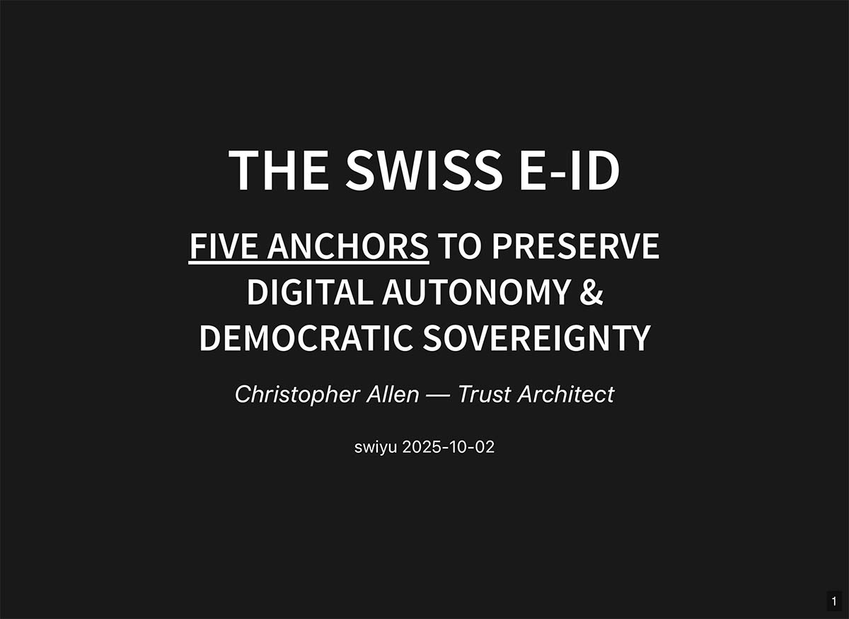 So why the concern? Despite the best intentions of the Swiss government, it’d be quite easy for their new e-ID system to be subverted, much as has happened with self-sovereign identity. When I talked at the October 2 meeting, my goal was therefore to present solutions that would help to avoid potential subversion, both in Switzerland and for other governments who adopt Swiss policies and technologies without having the same philosophies of autonomy at the heart of their democracy.